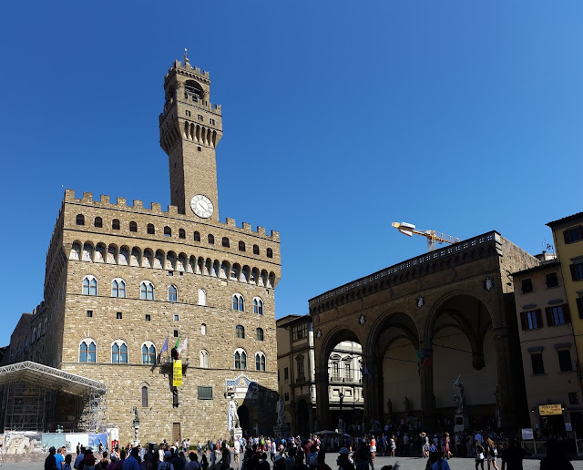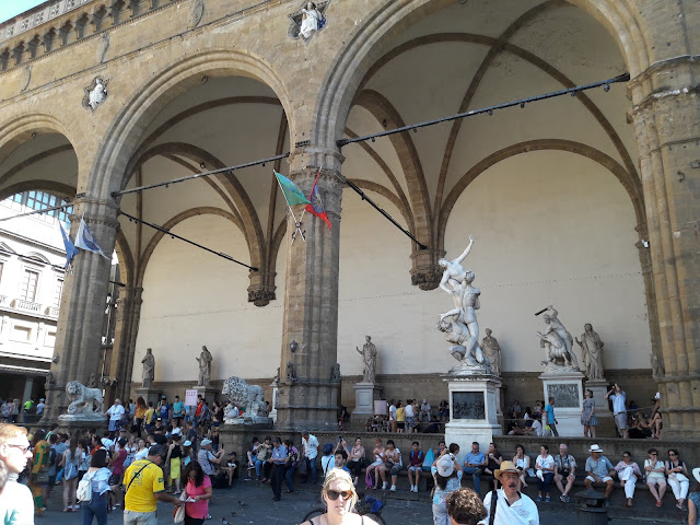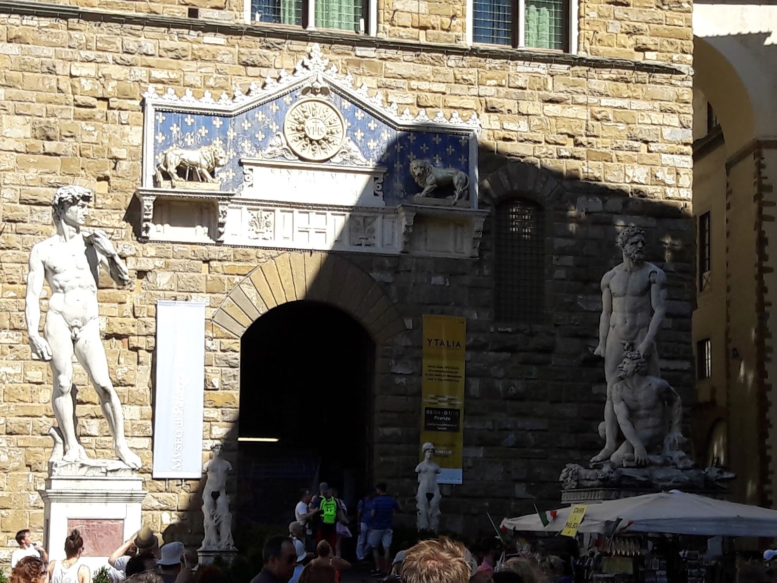 Weiter ging es zum Piazza della Signoria. Hier soll man viele Skulpturen u,A. auch den David finden, allerdings als Kopie. Die Piazza della Signoria, das Zentrum des kommunalen Lebens, von den Medici bis heute, einer der schönsten Plätze Italiens, mit dem Neptun-Brunnen (1575), der Reiterstatue von Cosimo I de' Medici (1595), und der Loggia dei Lanzi (Feldherrnhalle, 1376-1382) mit den berühmten Skulturerraub der Sabinerinnen und Perseus sowie dem Palazzo Vecchio.