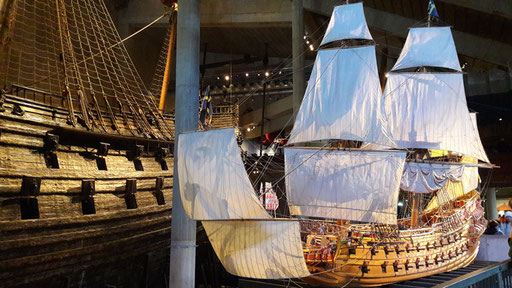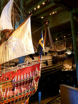 Von außen wirkt das Gebäude sehr unscheinbar - man sieht jedoch die Masten und es lässt sich erahnen, dass es sich um ein Schiff handelt. Der Eintritt kostet 13€ und man steht fast ohne Vorwarnung nach öffnen des Eingangstor vor einem Schatz: eine riesige, fast dunkle Halle, in der wie aus dem Nichts ein gewaltiges hölzernes Kriegsschiff bis zur Decke empor ragt. Die Vasa - das weltweit einzige Schiff aus dem 17. Jahrhundert, welches zu 98% im Original erhalten ist. Mit einer fantastischen Verzierung und hunderten geschnitzten Skulpturen ist das schwedische Kriegsschiff aber nicht nur eine wahre Augenweide sondern ein einzigartiges Kunstobjekt und eines der herausragendsten Touristenattraktionen auf der ganzen Welt.