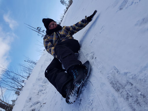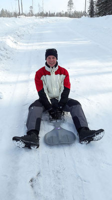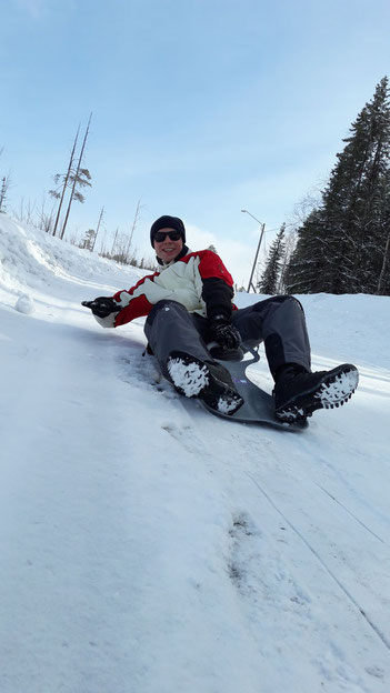 Frohen Mutes und total enthusiastisch gingen wir zurück zum Hotel und stiegen 20 Meter hoch auf den Berg, Rutschteller unter unseren Po und ab ging die wilde Fahrt.