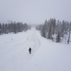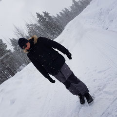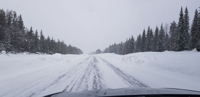 Um in das Landesinnere zu kommen, mussten wir Landstraße fahren und hier wurden nun doch Phils Befürchtungen war. Da es seit mehreren Stunden geschneit hat und man nicht einmal die Sonne sah, geschweige denn blauen Himmel, waren die Straßen dementsprechend auch noch nicht geräumt. Und da wir natürlich keine Spikes an den Rädern haben, musste Phil daher vorsichtig fahren. Kaum Jemand war an diesem Samstag unterwegs und so sah man auch selten ein Auto, auch Häuser sah man nicht – wir fühlten uns wie auf einem Highway durch die USA, nur eben mit Schnee.