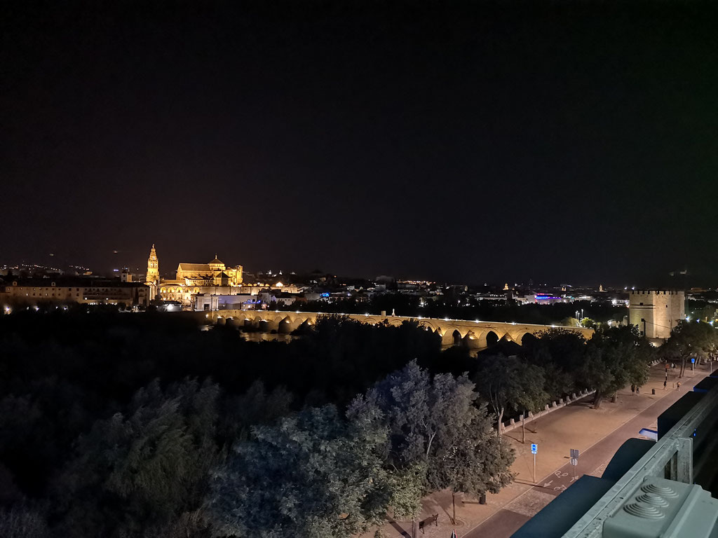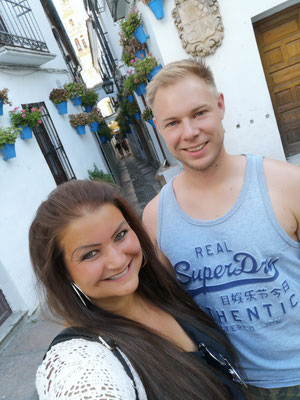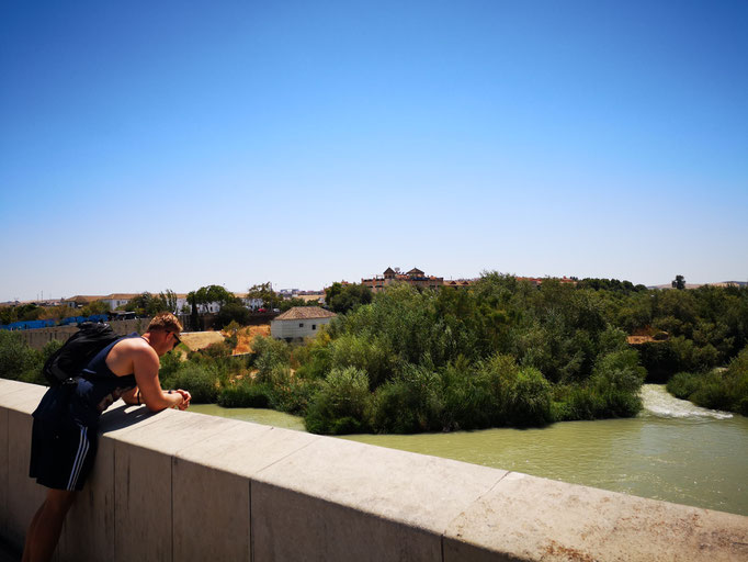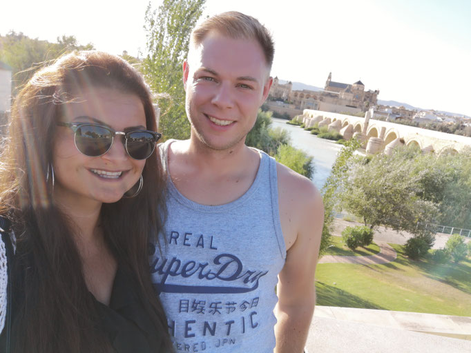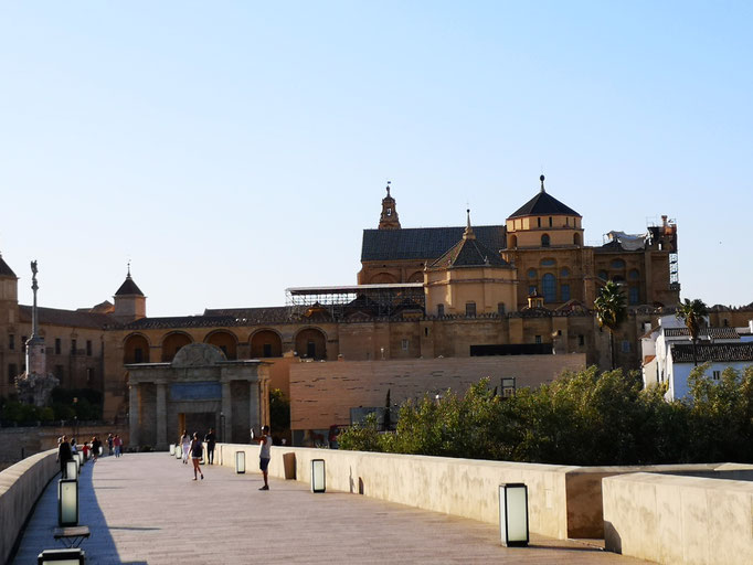 Am späten Nachmittag zogen wir uns in unser Zimmer zurück. Dieses Mal waren wir ganz mutig, denn im Reiseführer stand "verlieren Sie sich in den Gassen Córdobas" - na gut, dann verlieren wir uns. Frisch geduscht und startklar gingen wir am Abend in die Altstadt. Unser Hotel war direkt an dem Fluss und an der Brücke, welche Alt- und Neustadt miteinander verbindet. Als wir die Brücke sahen und dahinter die bekannte Mezquita erinnerte es uns ein wenig an Prag. Nur gibt es keine Statuen auf der Brücke und nicht ganz so viele Touristen, zumindest nicht im heißen August. Wir erreichten heute unsere Höchsttemperatur von 39 Grad und das abends 19.00 Uhr.