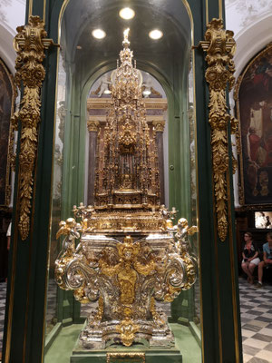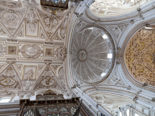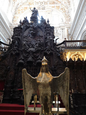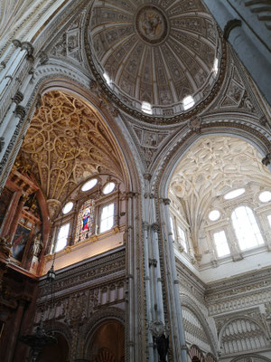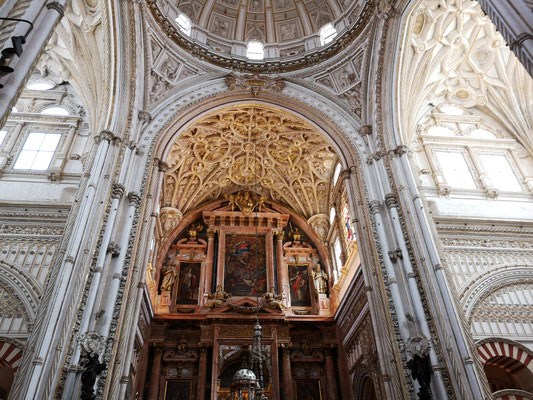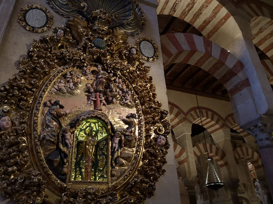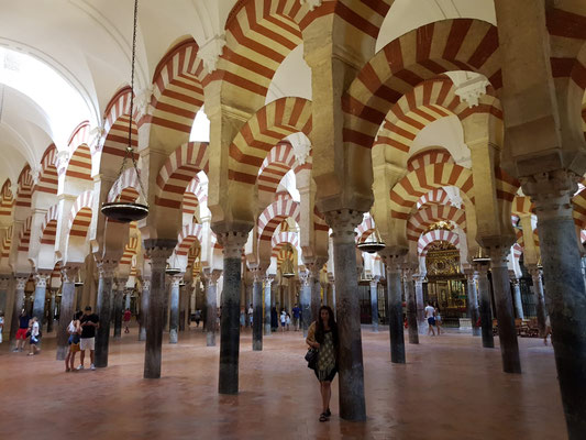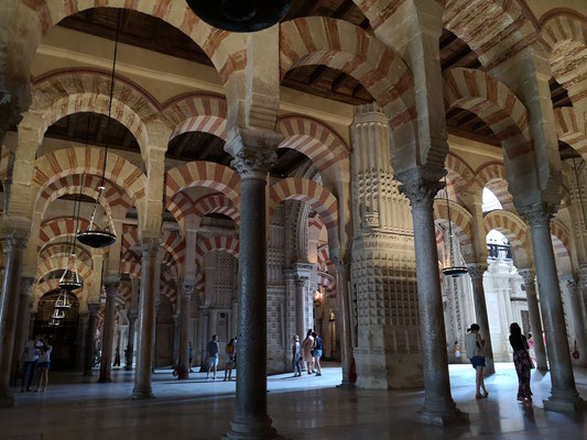 Beim Eintreten in die Mezquita findet man eine Ansammlung von Säulen und Bögen vor, deren Farben zusammen mit den Schatten den Betrachter in ihren Bann ziehen. Darüber hinaus sollte man die Moscheenerweiterung Al-Hakam II besichtigen, welche die prunkvollste des Gesamtkomplexes ist. Auch das prächtige "Mihrab" und die opulente Kuppel sind wunderschön anzuschauen. Was die christlichen Konstruktionen anbetrifft, sollte man nach der Besichtigung der Kapelle Capilla Real de Alfonso unbedingt die Kathedrale Michel de Verdiguer mit ihren beiden Kanzeln in Augenschein nehmen. Auch der spektakuläre Kirchenchor mit dem barrocken Chorgestühl des Pedro Duque Cornejo ist durchaus lohnenswert." (https://spainonline.com/de/andalusien/sehenswurdigkeiten/mezquita-moschee-von-cordoba.htm)