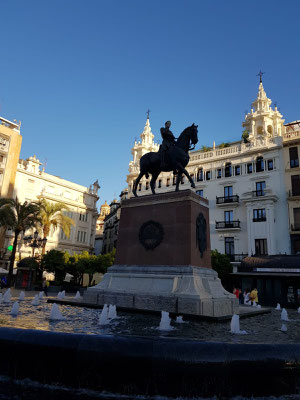 Zurück zum Plaza Tendillas: Umgeben von prächtigen Häusern fällt der Blick zunächst auf die Statue in der Mitte. Das Reiterstandbild des Gran Capitán - sofort fällt auf, dass der Kopf weiß ist und der Rest dunkel. Es handelt sich hierbei um zwei verschiedenen Materialien nämlich um Marmor und Bronze. Des Weiteren entdeckt man noch die Tendillas-Uhr an der Westseite des Platzes. Sie verkündet seit 1961 jede vollendete Viertelstunde und zwar nicht durch Glockenschläge sondern durch Gitarrenmusik.
