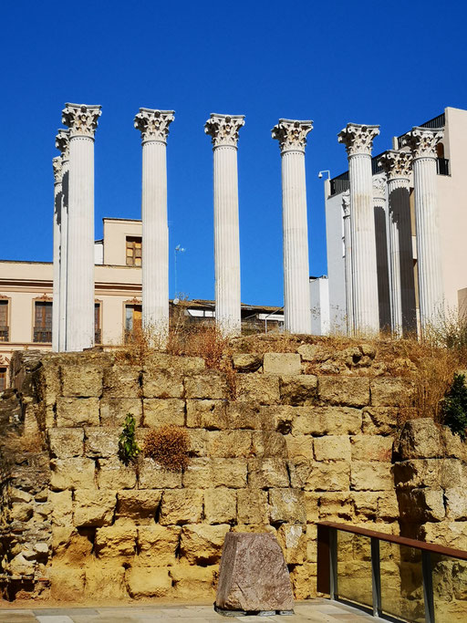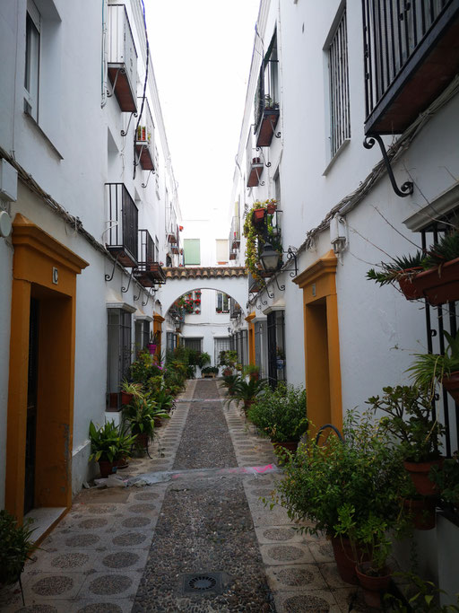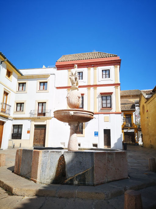 Die ausgegrabenen Säulen, mit beachtlichen Ausmaßen von 32 Metern, sind fast nur aus teurem Marmor gefertigt. Wir schlenderten über den Plaza de la Corredera. Mit 113 Metern Länge und 55 Metern Breite zählt die rechteckige Plaza de la Corredera zu den größten Plätzen Andalusiens. Kaum ein Haus hat heute noch die Verwendung von Früher. So befindet sich heute eine große Markthalle im Inneren eines Gebäudes, was früher als Gefängnis diente. Wir erkundeten den Plaza del Potro in dessen Mitte ein Springbrunnen mit einem steigenden Fohlens zu sehen ist. Zwischen seinen Vorderbeinen hält das Fohlen das Stadtwappen Córdobas. Zum Schluss gingen wir mit der Tour auch noch einmal durch das jüdische Viertel bis zurück zur Mezquita.