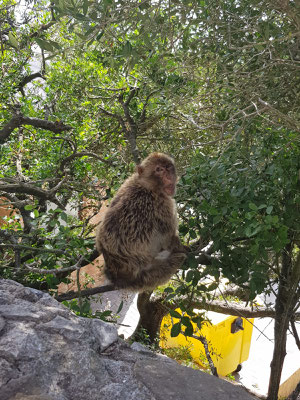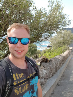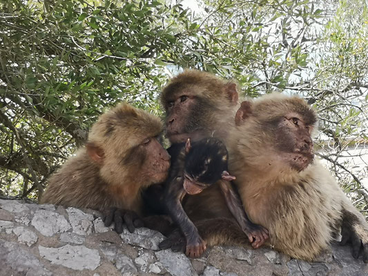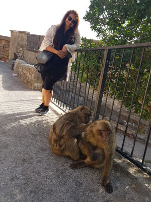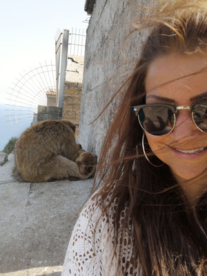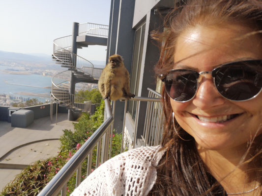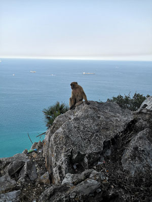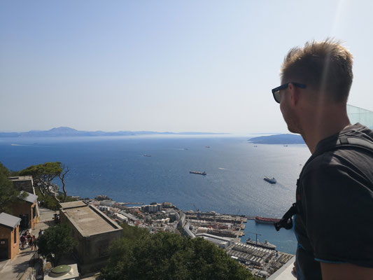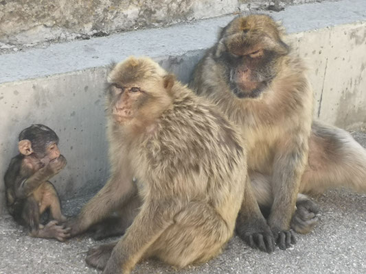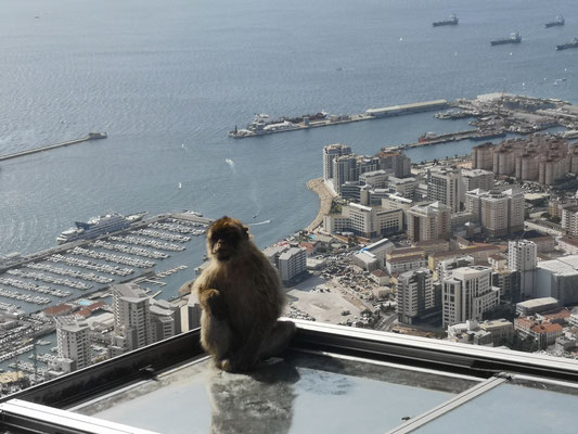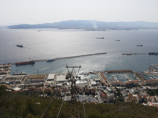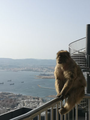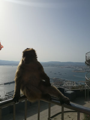 Danach fuhren wir mit dem Bus zur Seilbahnstation. Unser Tipp: Für diese Kombi buchten wir über Getyourguide schon die Tickets und hatten den Vorteil. lange Warteschlange für die Tickets umgehen zu können, jedoch nicht die Schlange, um in die Gondel zu steigen. Toll ist, dass man das Ticket für die Cabel Car an einem „Wunschtag“ nutzen kann. Leider mussten wir eine gute Stunde anstehen, um dann innerhalb 6 Minuten fast die Spitze des Affenberges zu erreichen. Sobald man die Endstation verlassen hat, wird man auch von den tierischen Einheimischen begrüßt. Manche der Affen sind sehr, sehr neugierig, manche sind sehr scheu, andere wiederum sind waghalsig und clever. Wir gingen zunächst auf eine Aussichtspattform und hatten einen unglaublichen Ausblick: unter uns sahen wir Gibraltar, Großbritannien, rechts erstreckt sich das spanische Festland, nach links schauend sieht man Afrika und geradeaus ist die Meeresenge, die „Straße von Gibraltar“, zu bewundern mit vielen Tankern. Allein für diese Aussicht hat sich die Tour gelohnt!