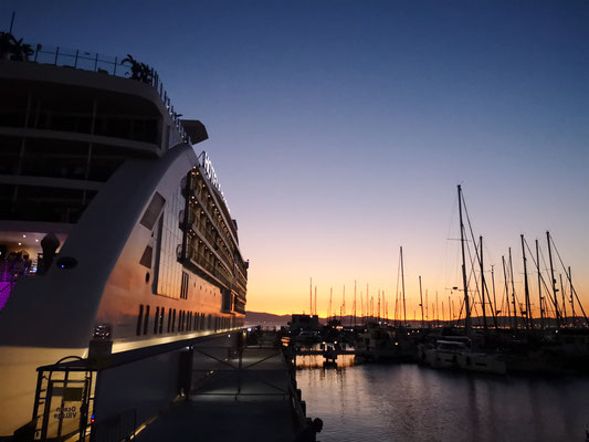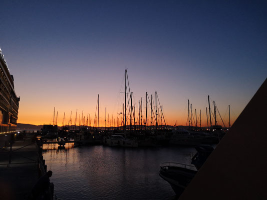 Kurz vor 21:00 Uhr sollte der EasyJet aus Großbritannien landen. Dank flightradar24.de über das Handy konnten wir das Flugzeug gut verfolgen und es folgten Verspätungsangaben über Verspätungsangaben. Nach einer Stunde beschlossen wir, weiterzuziehen. (Später erfuhren wir, dass der EasyJet in Bordeaux Zwischenlanden musste wegen Vogelschlag und erst am nächsten Tag wieder startete.) Wir liefen Richtung Hafen. Es wurde dunkel, windiger, kälter und wir beschlossen, zum Hotel zu gehen. Die Kontrollen auf dem Rückweg waren noch unspektakulärer als auf dem Hinweg. 10 Minuten später waren wir im Hotel – machten es uns auf unserem Balkon gemütlich und planten unseren nächsten Tag.