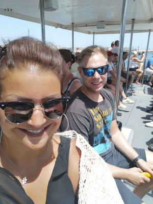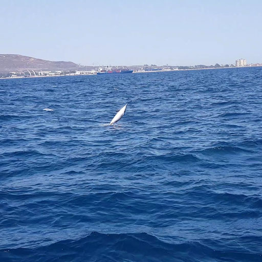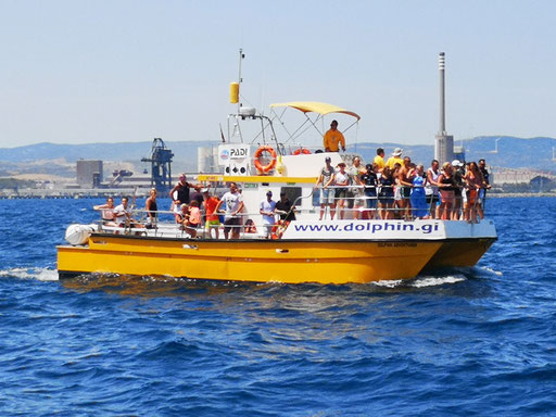 Es ging auf einen Katamaran – wir waren circa 25 Leute auf dem Boot. Optimale Gruppengröße! Plötzlich kam noch eine 30ig-köpfige Gruppe TUI-Reisender aus Frankreich hinzu – eindeutig zu viel! Bei leichtem Wellengang fuhren wir in die Bucht und die Crew und wir Gäste hielten eifrig Ausschau nach Delphinen oder sogar Walen. Die Delphine ließen tatsächlich nicht lange auf sich warten. Die Crew gab die Meldung, dass man auf der rechten Seite des Bootes die ersten Delphingruppen erspähen kann. Folglich haben sich alle auf die rechte Seite bewegt- ups, das war kurz etwas brenzlich und die Crew rief gleich alle zurück, nicht, dass wir noch kentern würden. Ohne Motorengeräusche trieben wir nun im Wasser und konnten den Delphinen beim Schwimmen und Springen zusehen. Es war sogar ein Babydelphin dabei. Natürlich haben wir uns gefreut, Delphine zu sehen und es war wirklich hübsch – noch einmal würden wir diese Tour aber nicht machen, denn es war viel zu unruhig und laut. Ich würde empfehlen die Beobachtung der Meeresbewohner entweder außerhalb Gibraltars machen oder darauf achten, dass die Tour für maximal 20 Leuten ausgelegt ist. Nichtsdestotrotz war es eine schöne Erfahrung, die Delphine zu beobachten.