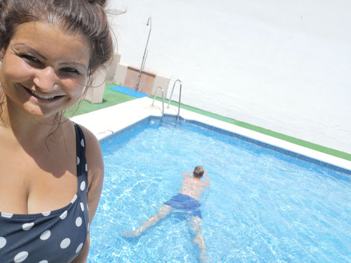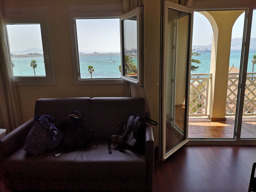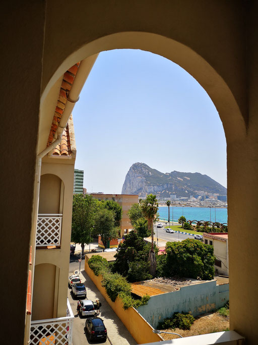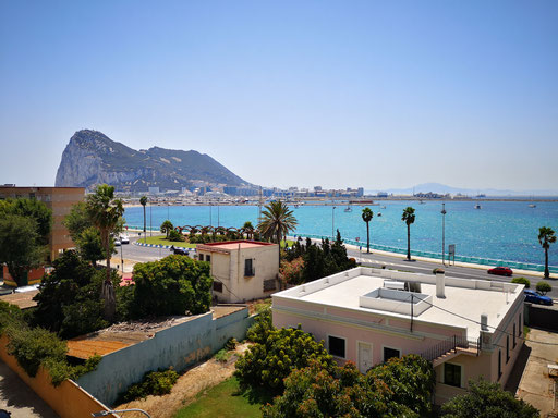 Die Rezeptionistin war sehr freundlich und gab uns umgehend ein Zimmer in der vierten Etage (421). Boa, was hatten wir für einen Phänomenalen Blick auf Gibraltar, auf das Meer und auf den berühmten Affenberg. Das Hotel an sich befindet sich in einer Nebenstraße mit Blick allerdings nicht nur nach Gibraltar, sondern auch zur Hauptstraße. Dementsprechend laut war es, wann man auf den Balkon heraustrat. Aber egal – man muss eben wählen zwischen einer tollen Aussicht zur Straße oder in den Innenhof zum Pool. Wir waren sehr zufrieden mit unserer Hotelauswahl.