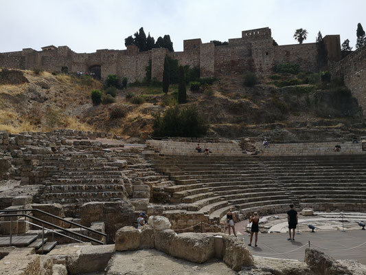 Alle Sehenswürdigkeiten sind sehr gut zu Fuß erreichbar und so brauchten wir auch nur ein paar Minuten, um vor dem doch beeindruckenden Teatro Romano zu stehen. Das Teatro Romano befindet sich im kulturellen Herzen der Stadt unmittelbar zu Füßen der Alcazaba. Natürlich kann man es nicht mit den Ausgrabungen in Rom oder mit dem Teatro auf Sizilien vergleichen, aber es ist eine Attraktion. Die Begehung ist Kostenfrei, allerdings gibt es nirgends Tafeln mit Beschreibungen etc. Es wurde 1951 zufällig bei Bauarbeiten für einen Park am Eingang des Hauses der Kultur entdeckt. Das Theater wurde zu Zeiten Augustus gebaut und bis in das 3. Jahrhundert unserer Zeit genutzt. Danach wurde es von den Arabern als eine Lagerstätte für Baumaterialien zum Wiederaufbau der Alcazaba verwendet.